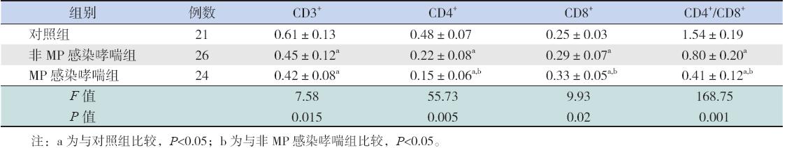 哮喘是由多种炎症细胞和炎症因子共同参与 的气道慢性炎症性疾病。作为一种变态反应性疾 病,哮喘存在体液和细胞免疫功能双重紊乱,表 现为辅助性T 细胞功能增强,而抑制性T 细胞功 能低下,研究发现Th1/Th2 比例失衡与哮喘发病 密切相关[12, 13]。CD3+ 为总T 淋巴细胞,代表机体 的细胞免疫功能状态;CD4+ 为辅助型/ 诱导型T 细胞,对细胞免疫起调节作用;CD8+ 为细胞毒抑 制型T 细胞,与CD4+ 功能相反[14]。临床上常用 CD4+/CD8+ 细胞比例来评价患者机体的免疫功能状 态[15]。本研究结果显示,在哮喘的急性发作期和 稳定期,患儿BALF 中CD3+、CD4+、CD8+、CD4+/ CD8+ 与对照组相比均有明显差异,急性期和稳定 期,CD3+、CD4+、CD4+/CD8+ 均较对照组降低,而 CD8+ 有上升。急性期时,伴MP 感染哮喘患儿的 CD4+ 和CD4+/CD8+ 明显低于无MP 感染的哮喘患 儿,而CD8+ 有上升;在稳定期,MP 感染组患儿 BALF 中仅CD4+/CD8+ 下降明显。提示无论是在急 性期还是稳定期,哮喘患儿BALF 中T 细胞的功 能异常主要表现在CD4+/CD8+ 的下降,这种改变 在伴MP 感染的哮喘患儿中尤为突出。患儿BALF 中CD4+/CD8+ 下降可能是CD8+ 数目增加所致,表 现为反复感染,说明气道局部免疫防御能力下降。 感染是哮喘急性加重的主要原因[16]。有研究 表明,CD8+ 细胞的主要功能是通过分泌IFN-γ 和 TNF 对感染和改变的宿主细胞起到溶解作用,防 止感染发生[17]。反复呼吸道感染可使CD8+ 细胞过 度聚集,引起肺损伤。本研究结果显示,CD8+ 细 胞在哮喘患儿气道可能出现异常浸润,导致免疫 损伤,进一步引起免疫功能下降。
