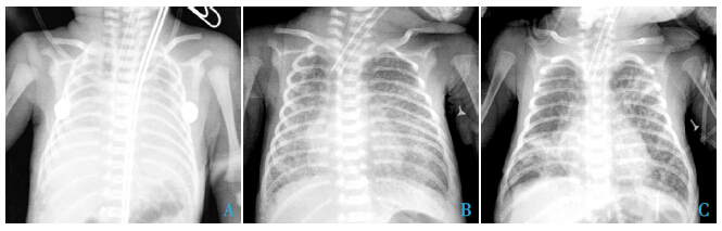 图 1 胸部X 线表现 A:生后1 d,呈RDS Ⅳ级改变;B:生后18 d,呈线条状或斑片状阴影间伴充气的透亮小囊 腔改变;C:生后28 d,表现为双肺野透亮区扩大呈囊泡状,伴两肺结构紊乱、散在条状或斑片影 |