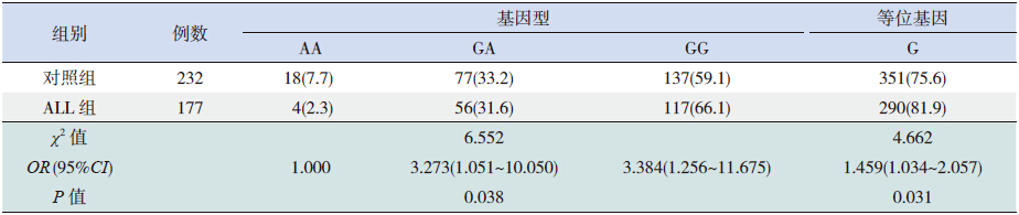 经检验,各组均符合Hardy-Weinberg 遗传平 衡定律。3 种基因型分布在ALL 组和对照组之间差 异有统计学意义(P=0.038),其中ALL 组G 等位 基因的频率高于对照组,说明G 为易感等位基因 (OR=1.459,95%CI:1.034~2.057,P=0.031); 且GA 以及GG 基因型的风险分别是AA 基因型的 3.273 与3.384 倍,见表 1。
