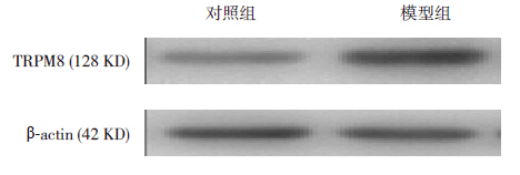 Western blot 检测结果显示模型组TRPM8 表 达水平(149±14)高于对照组(62±8)(t=560.93, P<0.01),见图 3。