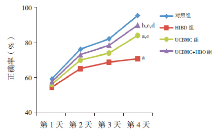 在连续 4 d测试中,对照组、UCBMC组、UCBMC+HBO组的正确率逐渐增高,而HIBD组正确率上升不明显;测试第4 d时UCBMC组正确率较HIBD组明显提高(P<0.01),但仍低于对照组(P<0.01),UCBMC+HBO组正确率明显高于HIBD组及UCBMC组(P<0.01,P<0.05),但仍低于对照组(P<0.05)。见图 2。
