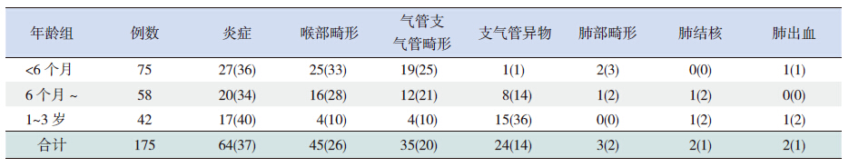 呼吸困难是儿科呼吸道疾病中常见的症状之一,尤其以婴幼儿多见,严重者可导致呼吸衰竭需机械通气治疗,如不能及时明确病因,往往导致撤机困难,严重影响婴幼儿生活质量,给社会、家庭带来沉重负担。因此,对呼吸困难病因的早期诊断十分重要。随着支气管镜技术及设备的不断发展进步,支气管镜技术在儿科领域正得到越来越广泛的应用[1],尤其在儿童呼吸道疾病诊疗中占据重要地位,为临床医生提供新思路,减少误诊。相关文献表明,在不同年龄段,呼吸困难常见病因亦不同[2, 3, 4, 5]。为进一步明确婴幼儿呼吸困难病因,本研究回顾性分析175例不明原因或常规临床治疗效果不明显的呼吸困难婴幼儿行电子支气管镜检查及治疗的临床资料,现报告如下。 1 资料与方法 1.1 研究对象