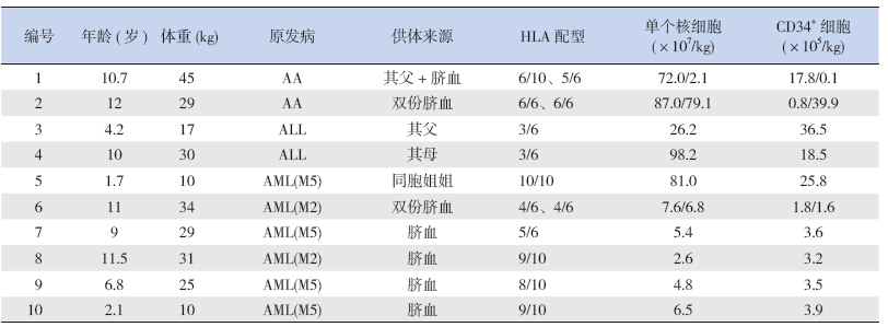 研究对象为2011年4月至2014年4月10例行allo-HSCT的血液病患儿,10例患儿的基本情况见表 1。病例1、2为AA患儿,其中病例1存在血小板输注无效,且常规环孢素免疫抑制及其他促造血药物治疗效果不佳;病例2两次抗淋巴细胞球蛋白/抗胸腺细胞球蛋白冲击治疗血象不升。病例3系急性淋巴细胞性白血病(ALL)复发患儿。病例4系ALL高危组患儿,化疗过程中微小残留白血病(MRD)有升高趋势,提示复发可能。病例5~10为急性髓性白血病(AML)患儿,均为二次化疗才达到缓解,部分初诊时即存在中高危的指标。故以上病例均符合MSC移植的指征。