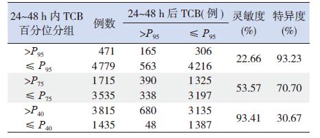 有研究表明,随着出生后胆红素水平随日龄的增加,预测新生儿高胆红素血症的准确性随之增加,AUC 从出生后24 h的0.91增至出生后72 h的0.99;在高度危险区,胆红素上升速度在出生后48~72 h上升速度进一步下降,但仍处于上升趋势,72 h后至96 h上升速度明显减慢,直至96 h停止上升,所以密切观察小时胆红素值(特别是出生后72 h内)和72 h后及时随访,对预测高胆红素血症的发生风险至关重要[6, 7]。本研究中,利用24~48 h和49~72 h前TCB 水平预测两个时段之后的高胆红素血症发生风险的ROC 曲线下面积分别为0.77和0.85,根据随访标准,在73~96 h前后,对85%,即4 463例新生儿开展随访,其中574例被诊断有高胆红素血症,其ROC 曲线下面积为0.87。此结果与上述研究中AUC 随时间增加而增大的趋势类似,并且也提示73~96 h的TCB 值对于预测新生儿高胆红素血症具有较高的价值,值得关注。由于国内目前没有小时龄进行出院后随访的标准,因此该研究中的随访主要是结合此次多中心合作项目中的随访标准来开展的,现在我们已完成了贵州省内的新生儿TCB小时龄列线图,今后可利用该图制定随访计划。