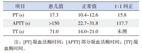 患儿男,8岁,2岁时外伤后易流血不止,反复皮肤瘀斑及关节血肿。7岁因膝关节血肿无法行走,就诊于当地医院,血常规检查示血小板数正常,肝肾功能无异常。多次行凝血功能检查,示凝血活酶时间(PT)15~21.2 s( 参考值10.5~13.5 s),活化部分凝血活酶时间(APTT)及凝血酶时间(TT)测不出;凝血因子活性Ⅷ23.4%(参考值50%~150%),凝血因子Ⅸ 3.7%(参考值60%~120%)。诊断为血友病乙,予凝血酶原复合物输注无明显效果。就诊于我院后查血、尿、便常规及肝肾功能、心肌酶均正常。血管性血友病因子vWF(-)。凝血功能及APTT 纠正试验结果见表 1,提示正常血浆纠正试验仅部分纠正。Ⅷ因子抑制物阴性,凝血因子活性检测:F Ⅷ :C19.4%,F Ⅸ 6.8%,F Ⅺ 10.8%,F Ⅻ 9.0%,均降低,但经过稀释试验显示凝血因子Ⅷ、Ⅸ活性均正常,提示血液中存在凝血因子抑制物。抗凝血酶AT- Ⅲ为181%,蛋白S 活性为62%,蛋白C 活性为0。鼠药等毒物筛查(-)。狼疮抗凝物、抗心磷脂抗体谱为阴性;血清免疫固定电泳(-)。全身弥散加权成像未见明显异常。抗核抗体ANA、抗可提取组织抗原抗体抗ENA(-)、抗中性粒细胞胞浆抗体ANCA(-)。乙肝、丙肝、梅毒、艾滋抗体均阴性,EB 病毒抗体IgA、IgM 均阴性,TORCH-IgM,真菌D 葡聚糖试验、降钙素原均阴性,淋巴细胞培养+ 干扰素A+B 均阴性。