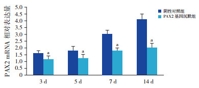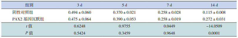 1.4 制作 UUO动物模型及体内转染64只 Wistar大鼠用水合氯醛麻醉后,沿左耻骨上切开,在左肾下方找到并分离出输尿管,将输尿管上、下结扎两处,从中间进行剪断 [7]。随机分为阴性对照组和 PAX2基因沉默组,每组32只。将 200 μL NC-siRNA-in vivo jetPEITM混合液分成 4份(每份 50 μL),在每只阴性对照组大鼠肾脏上、下极和肾脏两侧缘的中央分别进行肾脏被膜下注射,分层缝合后关闭腹腔;将 200 μLPAX2-siRNA-in vivo jetPEITM混合液分成 4份(每份 50 μL)给每只 PAX2基因沉默组大鼠进行注射,注射部位同阴性对照组。再将两组大鼠按转染后 3、5、7、14 d分为 4个亚组,每亚组 8只大鼠。
