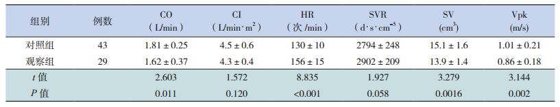 将观察组治疗前结果与治疗后最末次检查结果进行比较,发现观察组治疗后HR较治疗前降低,CO,CI,SVR,SV,Vpk较治疗前改善,差异有统计学意义(P<0.05),观察组治疗后各项指标均恢复到正常范围。见表 2。