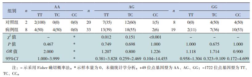 | 表 4 +49位点与-1722位点各组合基因型频率在病例组与对照组的比较[例(%)] |