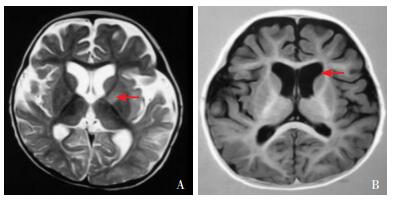 图 1 头颅磁共振检查 头部MRI的T2WI相(图A)显示左侧基底节区信号异常(如箭头提示),双侧额、颞、岛叶脑萎缩,双侧外侧裂池增宽;T1WI相(图B)显示左侧侧脑室稍扩张(如箭头提示)。 |