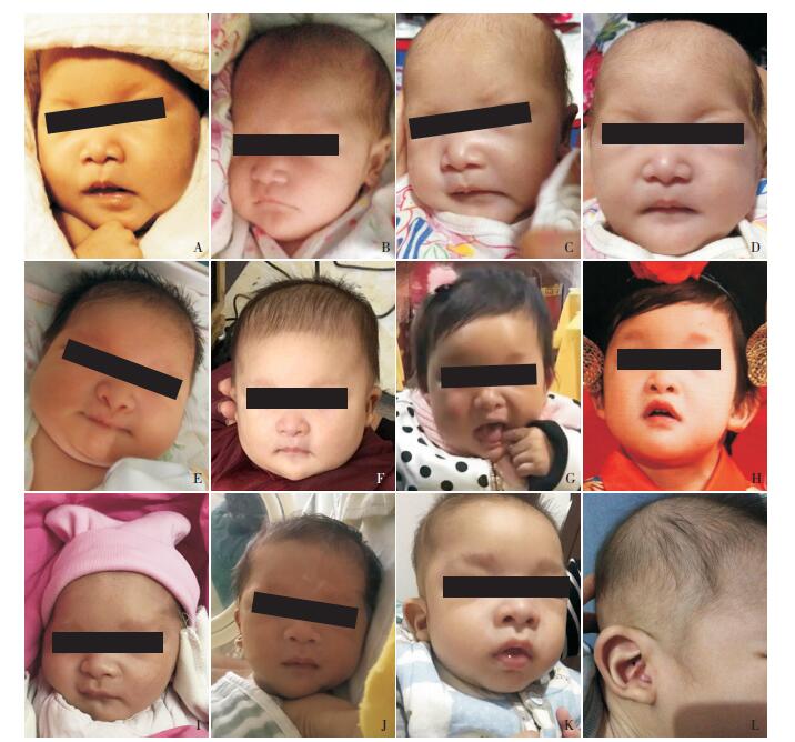 图 1 3例Mowat-Wilson综合征患儿的特殊面容对比 A~D:为病例1面部照片,图A、C示宽鼻梁、鹰钩鼻、眼距增宽,图B示耳垂异常,图D示鼻小柱突出、小下颌;E~H:分别为病例2生后1 d、1月、1岁及2岁时的面部照片,图E、F示眼距增宽、鹰钩鼻、宽鼻梁、小下颌,图G、H示眼眶深陷、前额突出、耳垂隆起、鼻梁塌陷、眉头增粗断裂,图E~H可观察到患儿随年龄增长其前额突出、眼眶深陷更加明显,眉头断裂增粗亦初步显现;I~L:分别为病例3生后1 d、1月、6月龄正面、6月龄侧面的照片,图I、J示眼距增宽、宽鼻梁、小下颌,图K示前额突出、眼眶深陷、鹰钩鼻、小下颌,图L示耳垂隆起,图I~L可观察到患儿随年龄增长其前额突出、眼眶深陷、耳垂隆起逐渐明显。 |