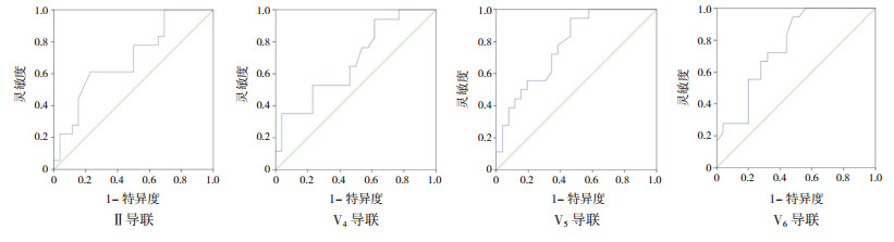 绘制ROC曲线以评价Ⅱ、V4、V5、V6导联T波振幅对扩张性心肌病患儿LVEF < 50%的预测价值, 结果表明, Ⅱ、V4、V5、V6导联T波振幅对扩张性心肌病患儿LVEF < 50%具有预测价值(P < 0.05)。Ⅱ、V4导联T波振幅的AUC分别为0.694、0.682, 检验效能较低; V5、V6导联T波振幅的AUC为0.775、0.762, 检验效能中等。Ⅱ导联最佳截断值为0.208 mV, 灵敏度61.1%, 特异度76.9%;V4导联最佳截断值为0.423 mV, 灵敏度94.1%, 特异度38.5%;V5导联最佳截断值为0.333 mV, 灵敏度94.4%, 特异度53.8%;V6导联最佳截断值为0.283 mV, 灵敏度94.4%, 特异度52.0%。见表 2和图 1。