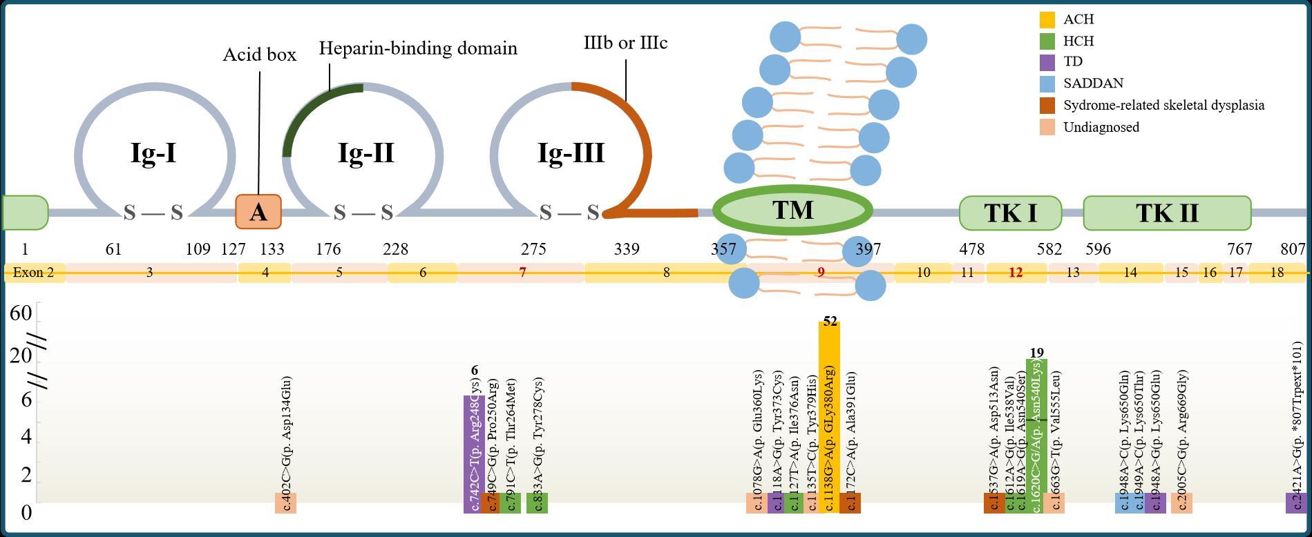 图1 本队列FGFR3基因变异位点模式图 [ACH]软骨发育不全;[HCH]软骨发育不良;[TD]致死性侏儒症;[SADDAN]严重的软骨发育不全伴发育迟缓和黑棘皮病;[Sydrome-related skeletal dysplasia]综合征型骨骼发育异常;[Undiagosed]临床未确诊;[Ig]免疫球蛋白样结构域;[Acid box]酸性盒;[Heparin-binding domain]肝素结合域;[TM]跨膜结构域;[TK]酪氨酸激酶结构域。图中自上而下依次展示了FGFR3蛋白结构图、FGFR3基因外显子结构图和本研究患儿基因变异位点分布。柱状图显示各变异位点在队列中的出现频次。变异主要集中于第7号、9号和12号外显子处,分别对应FGFR3蛋白的IgⅢ结构域前半段、跨膜结构域和酪氨酸激酶结构域。相关临床表型以ACH、HCH和TD为主。