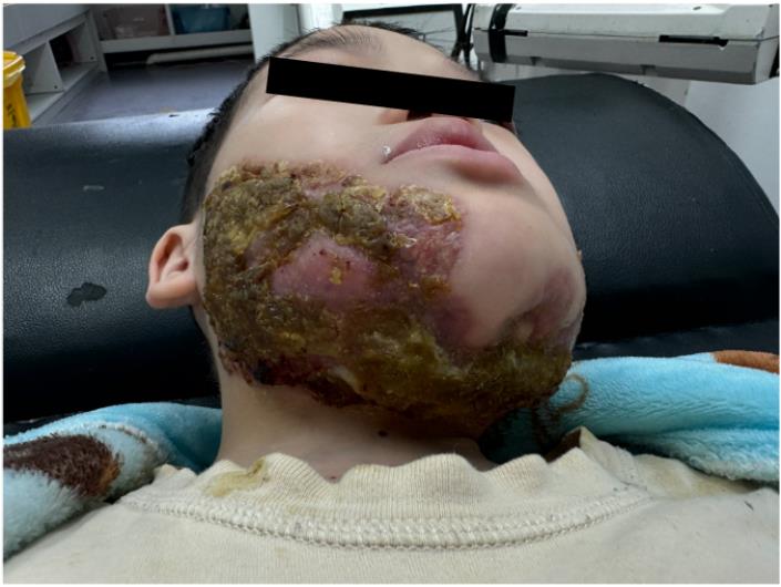 患儿入院时皮疹情况 双侧下颌及颏部可见大片浸润性红色斑块,表面黄色油腻蛎壳状结痂,无结痂处有轻度糜烂、渗出,触痛明显。
