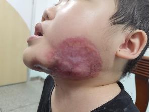 出院2周后复诊图片 双侧下颌、颏部可见边界较清楚的红色斑片。