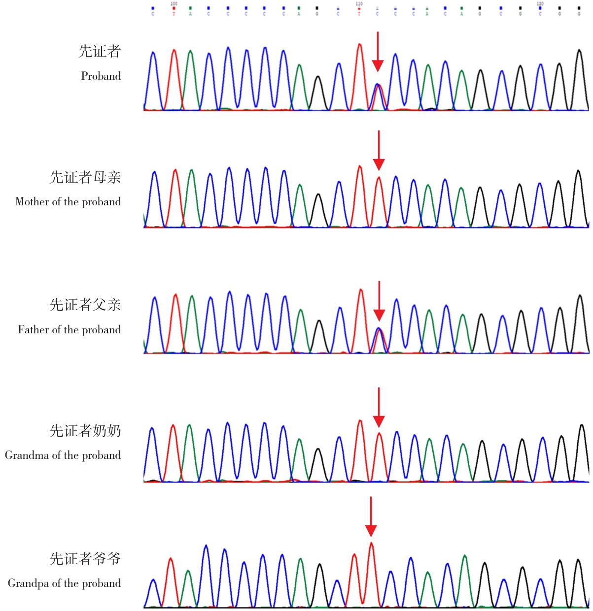 基因存在c.175T>C(p.Ser59Pro)杂合错义突变,患儿父亲此位点有变异,患儿母亲、爷爷、奶奶该位点无变异。箭头所示为变异位点。